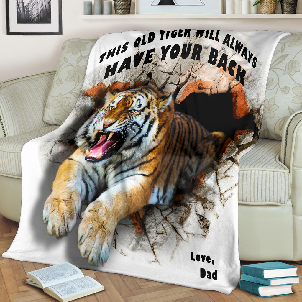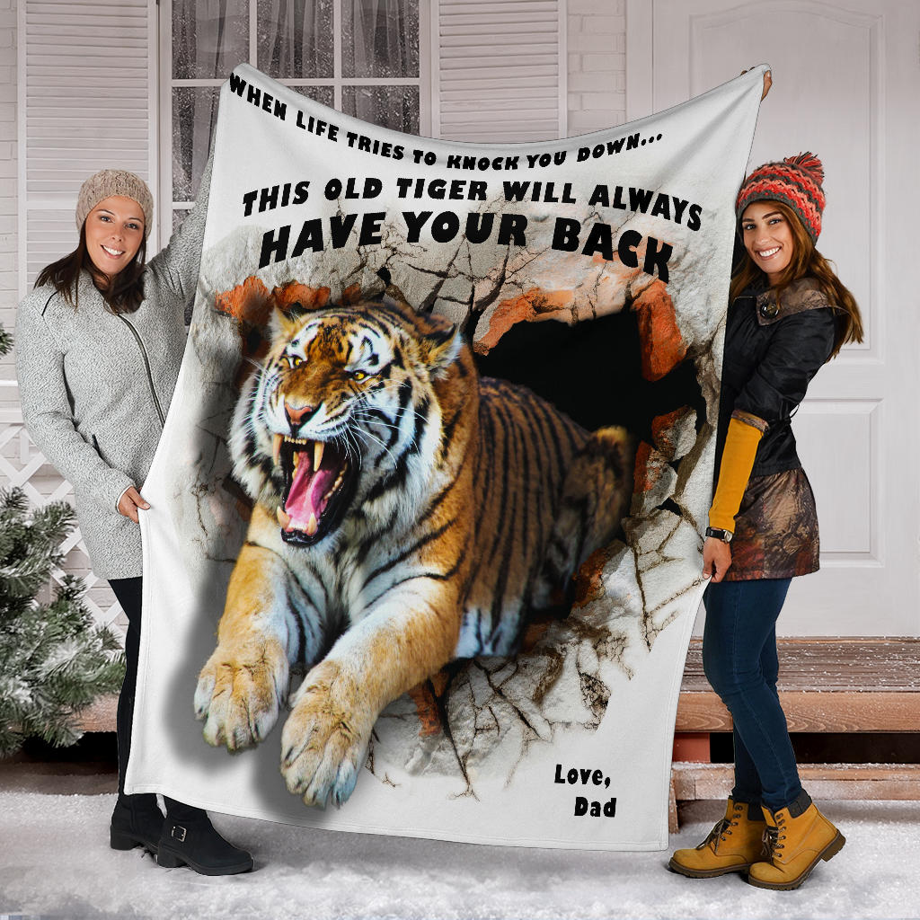 Blanket reads: "WHEN LIFE TRIES TO KNOCK YOU DOWN... THIS OLD TIGER WILL ALWAYS HAVE YOUR BACK. Love, Dad"